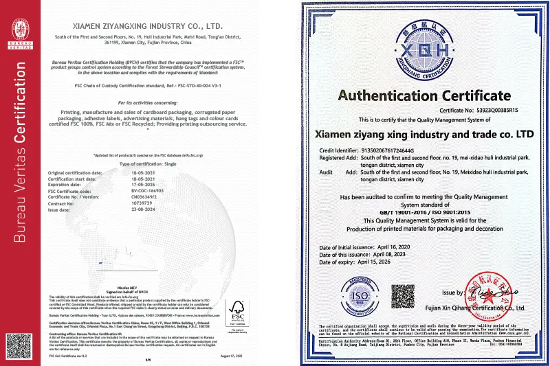 V: Meil on FSC, FDA, SGS, VOC ja vastavus keskkonnaeeskirjadele, nagu RoHS, 94/62/EC ja USA TPCH. Meie tehasel on juhtiv rahvusvaheline pakenditarnija ja eksportija ISO9001 sertifikaat.